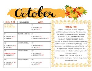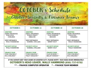 Calendars for all of our Finance Team, Greeters, Nursery, Security, and Kids Club Volunteers posted here.