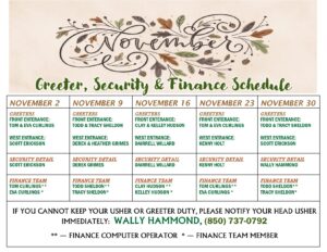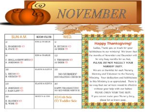 Calendars for all of our Finance Team, Greeters, Nursery, Security, and Kids Club Volunteers posted here.